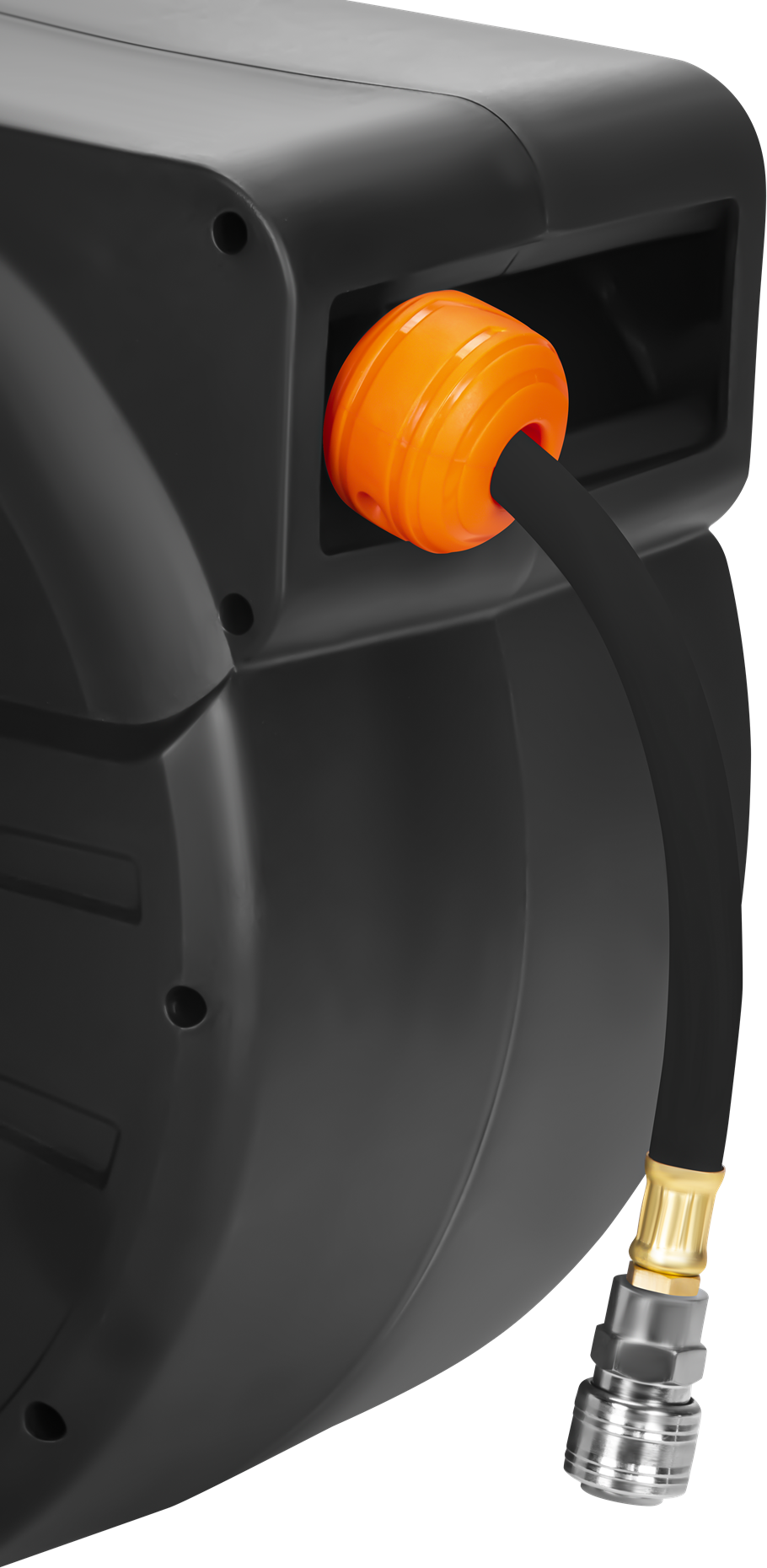 Звивачка оснащена пружинным механизмом с блокировкой, что позволяет автоматически останавливать шланг на выбранной длине. Поворотный кронштейн с диапазоном 180° позволяет удобно устанавливать устройство на стене или потолке и свободно работать в разных направлениях. Прочный корпус из пластика и эластичный шланг из ПВХ обеспечивают устойчивость к интенсивному использованию в условиях мастерской.