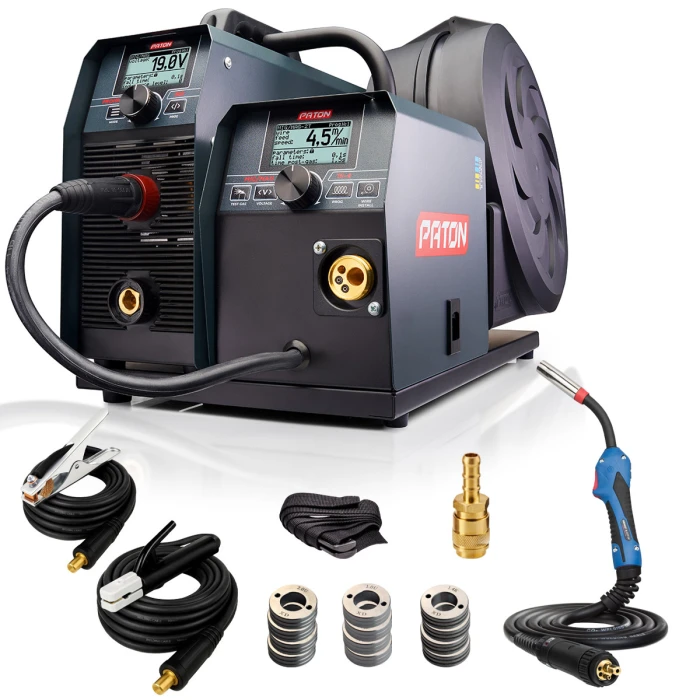 PATON ProMIG-350-15-4 обладнаний якісним металевим 4-х роликовим механізмом подачі дроту з потужним герметичним двигуном, а універсальний роз'єм KZ-2 типу "ЄВРО" дозволяє підключати зварювальні пальники від широкого ряду виробників. Потужний кронштейн під зварювальний дріт дозволяє встановлювати котушки, вагою до 15 кг. Модель ProMIG-350-15-4, в поєднанні з високою потужністю і продуктивністю, має невелику вагу і габаритні розміри. А завдяки РК-екранам апарат легко і зручно налаштувати для вирішення будь-якої задачі. Апарат комплектується якісними аксесуарами від компанії ABICOR BINZEL, які дозволяють відразу почати працювати в режимах MIG/MAG та MMA.